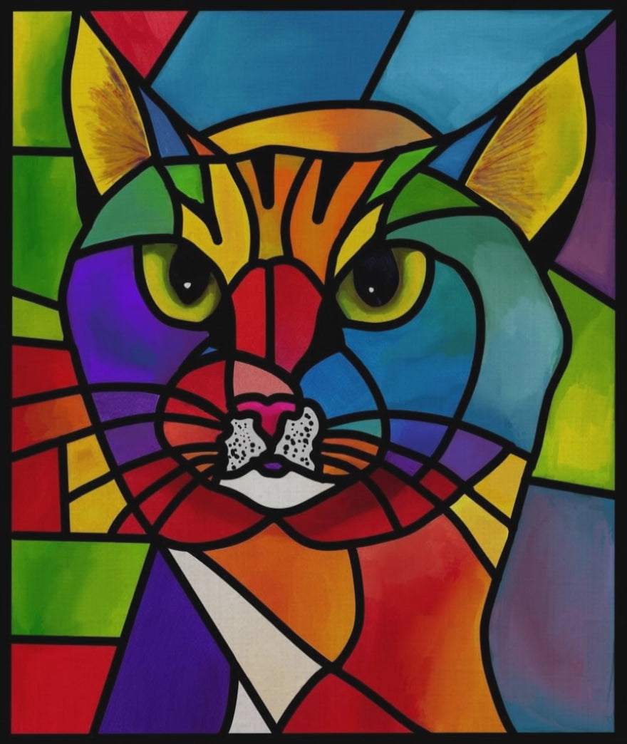 Bossy is a striking contemporary cat art print that captures the unmistakable presence of a feline who rules the room without asking permission. This expressive portrait blends the charm of modern animal art with the luminous beauty of stained-glass aesthetics, where bold black lines divide radiant, jewel-like colors into glowing fragments of light and form.